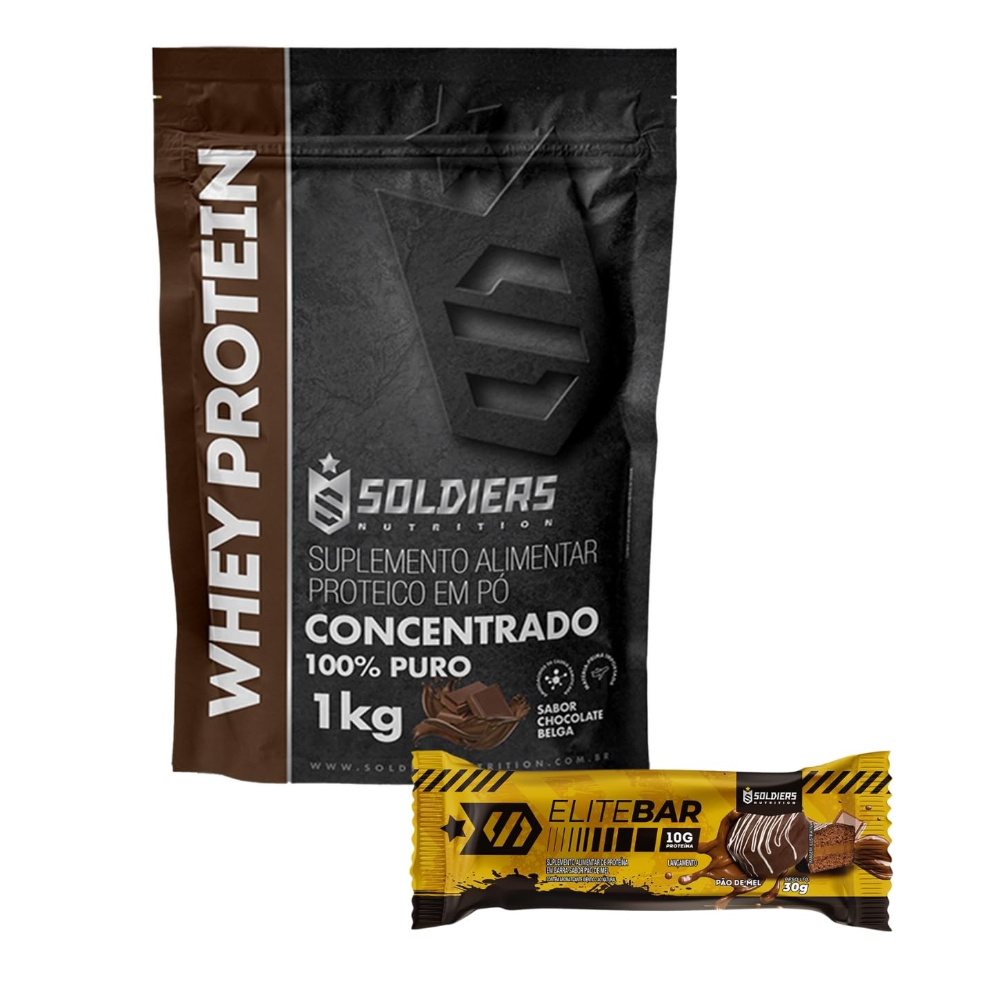 Kit: Whey Protein 1Kg Chocolate Belga + Barrinha Elitebar Pão de Mel 30g – Soldiers Nutrition
