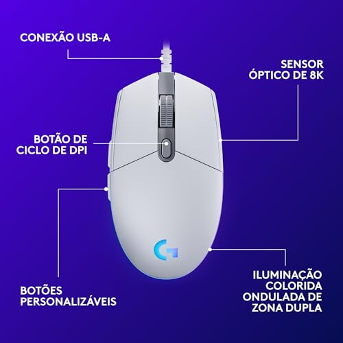Eleve seu jogo com o Logitech G203! Este mouse gamer combina desempenho avançado com um design elegante, perfeito para gamers que buscam precisão e estilo. Confira as principais características: