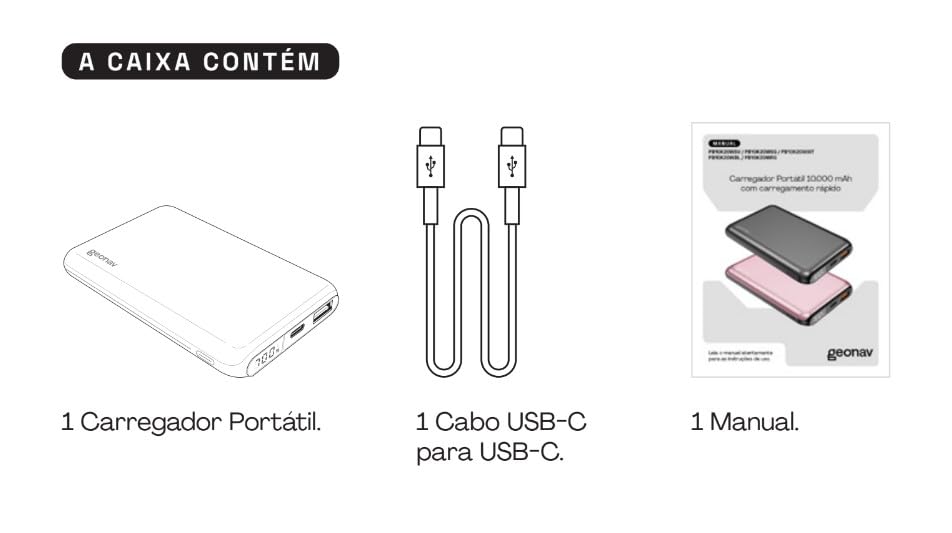 Mantenha seus dispositivos sempre carregados com o Geonav Power Bank, um carregador portátil universal que combina potência e praticidade em um design compacto.
