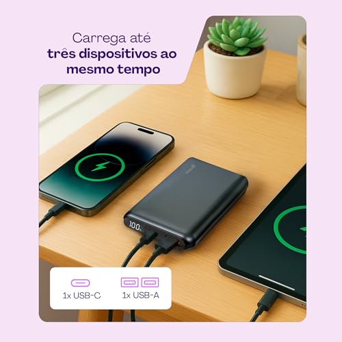 - Duas portas: USB-A e USB-C para múltiplas opções de carregamento.